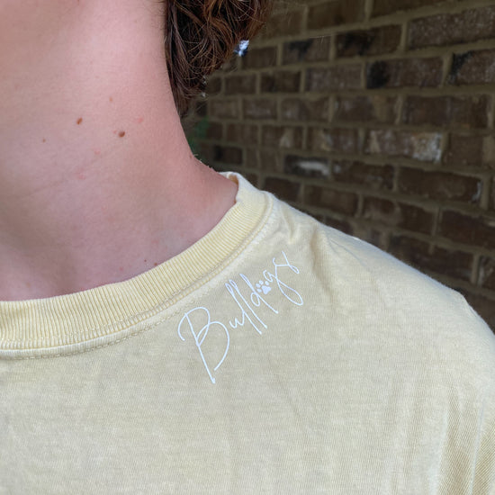 - Front of Shirt: Design Located at the Collar of the Shirt and Says "Bulldogs" with a Paw Print Replacing the "o"
