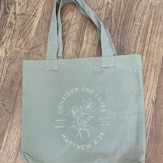 - Tote Design: Says, “Consider the Lilies”, "Mathew 6:28", Trust / Worry", Faith / Fear"