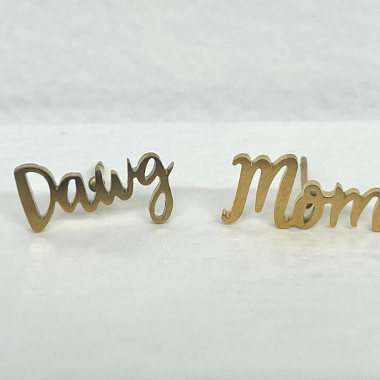 - Stud Earrings that Say “Dawg” and “Mom”