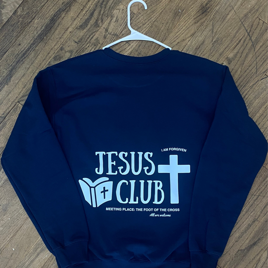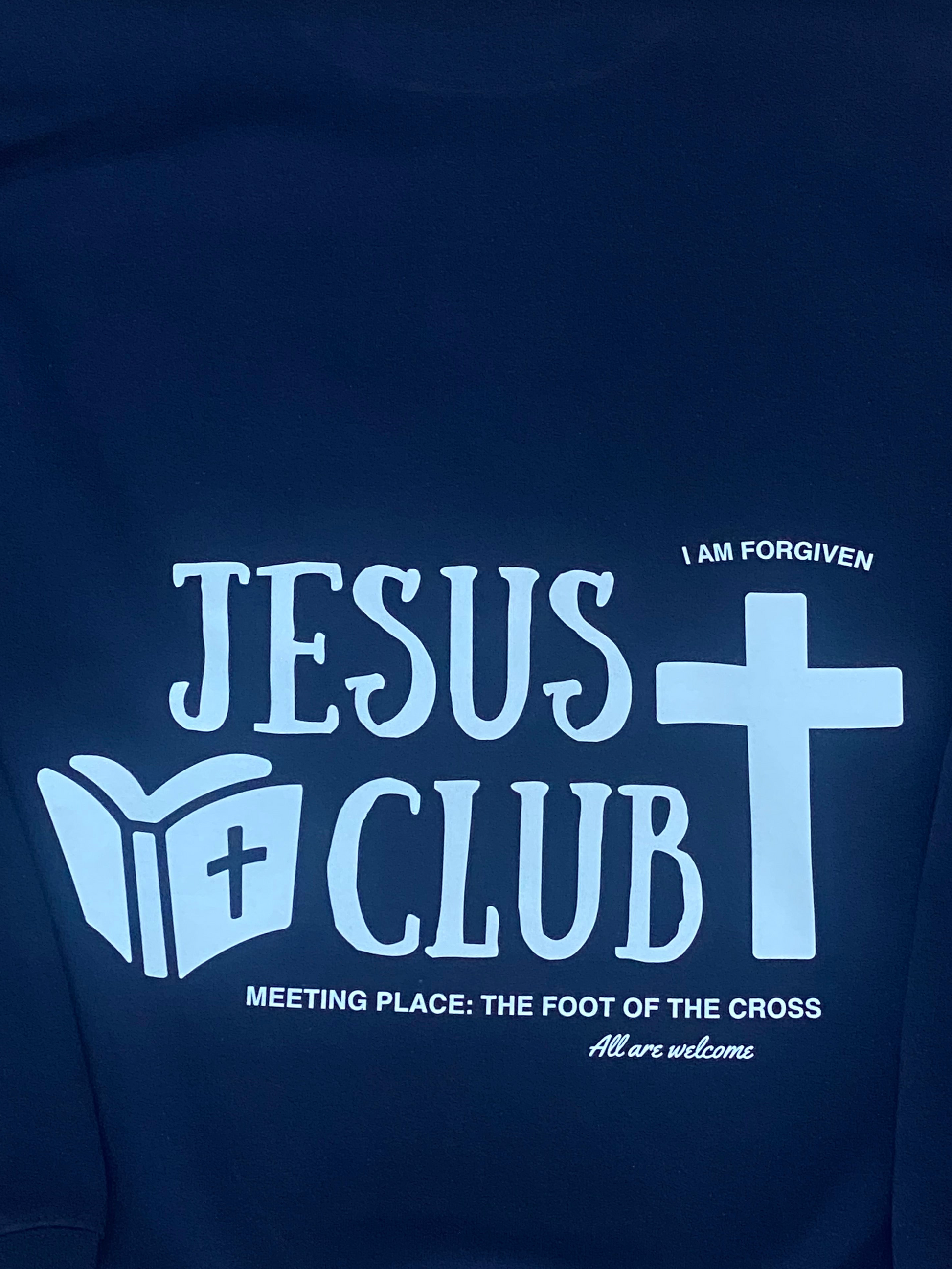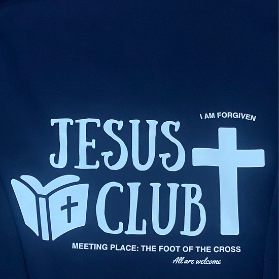 - Back of Sweatshirt: Says, "JESUS CLUB", MEETING PALCE: THE FOOT OF THE CROSS", "I AM FORGIVEN', And "ALL ARE WELCOME" with Bible and cross icon