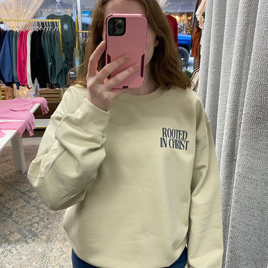 - Front of Shirt: Pocket Size Design Reading "ROOTED IN CHRIST"
