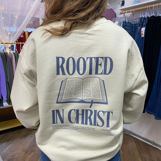 - Back of Shirt: Large Design Reading, "ROOTED IN CHRIST" and Colossians 2:6-7 with a Bible Icon