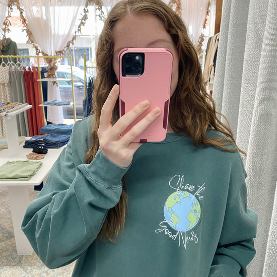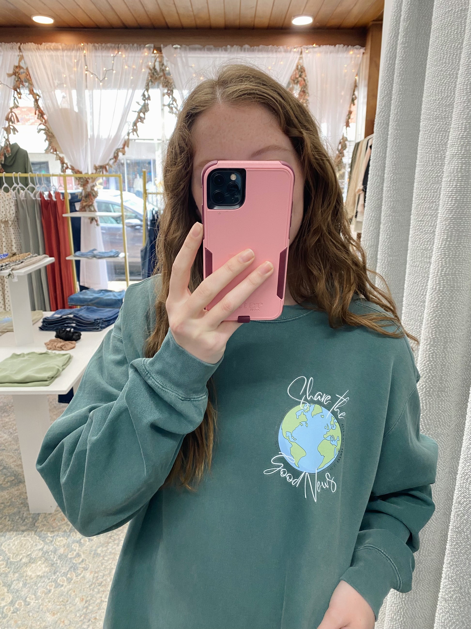 - Back of Sweatshirt: Large Design of the Earth Surrounded with the Saying, "Spread the Good News" and Four Bible Verses