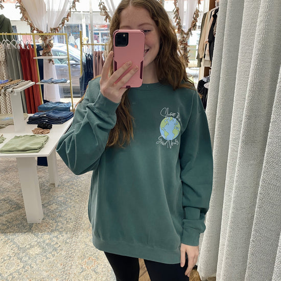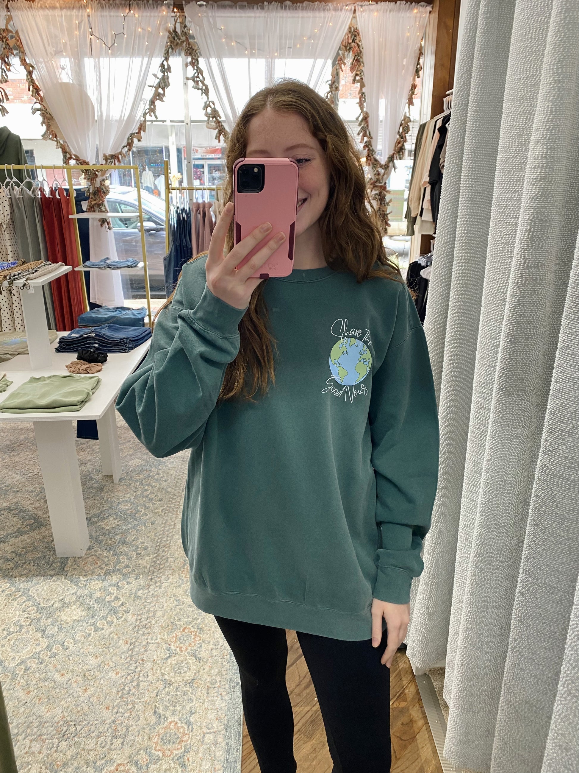 - Color: Blue Spruce Sweatshirt with White and Black, White, Blue, and Green Ink