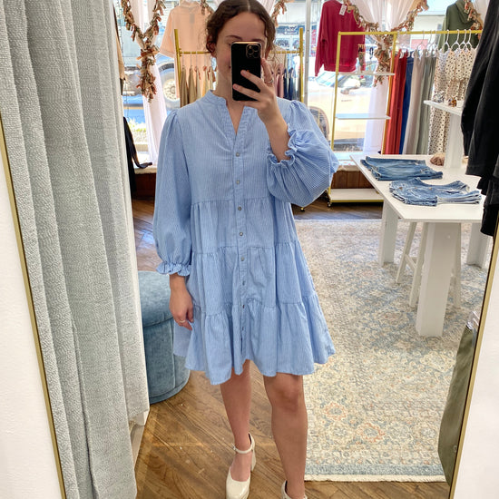 - Button Down Stripe Woven Tiered Dress with Pockets