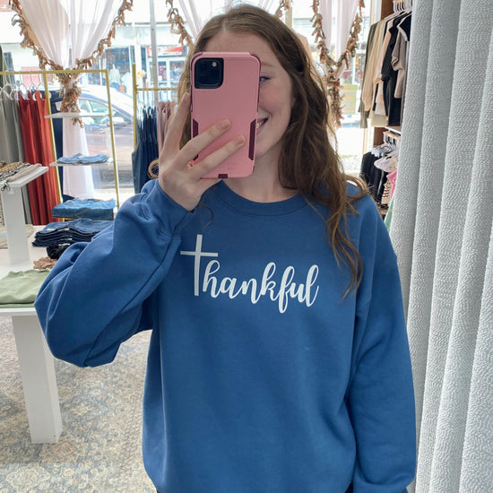 - Front of Sweatshirt: Says "thankful" with a cross icon as the "t"