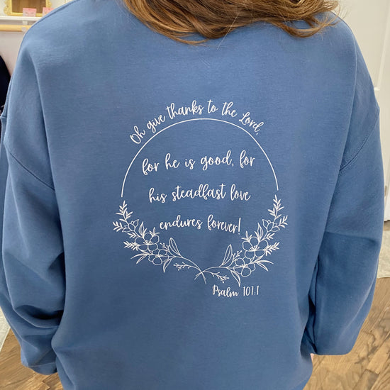 - Back of Shirt: Design reads Psalm 107:1 and includes a floral circle design