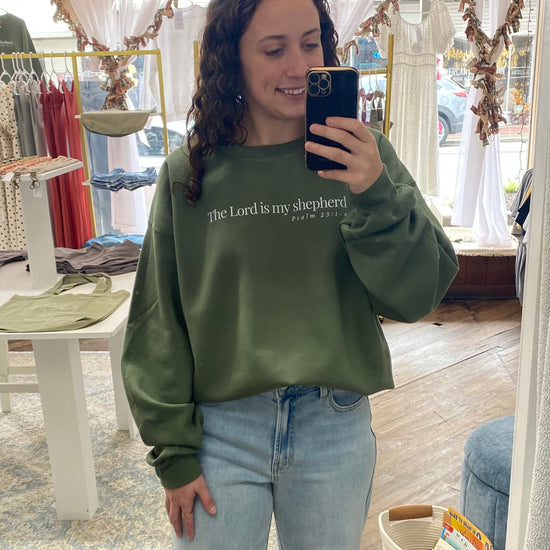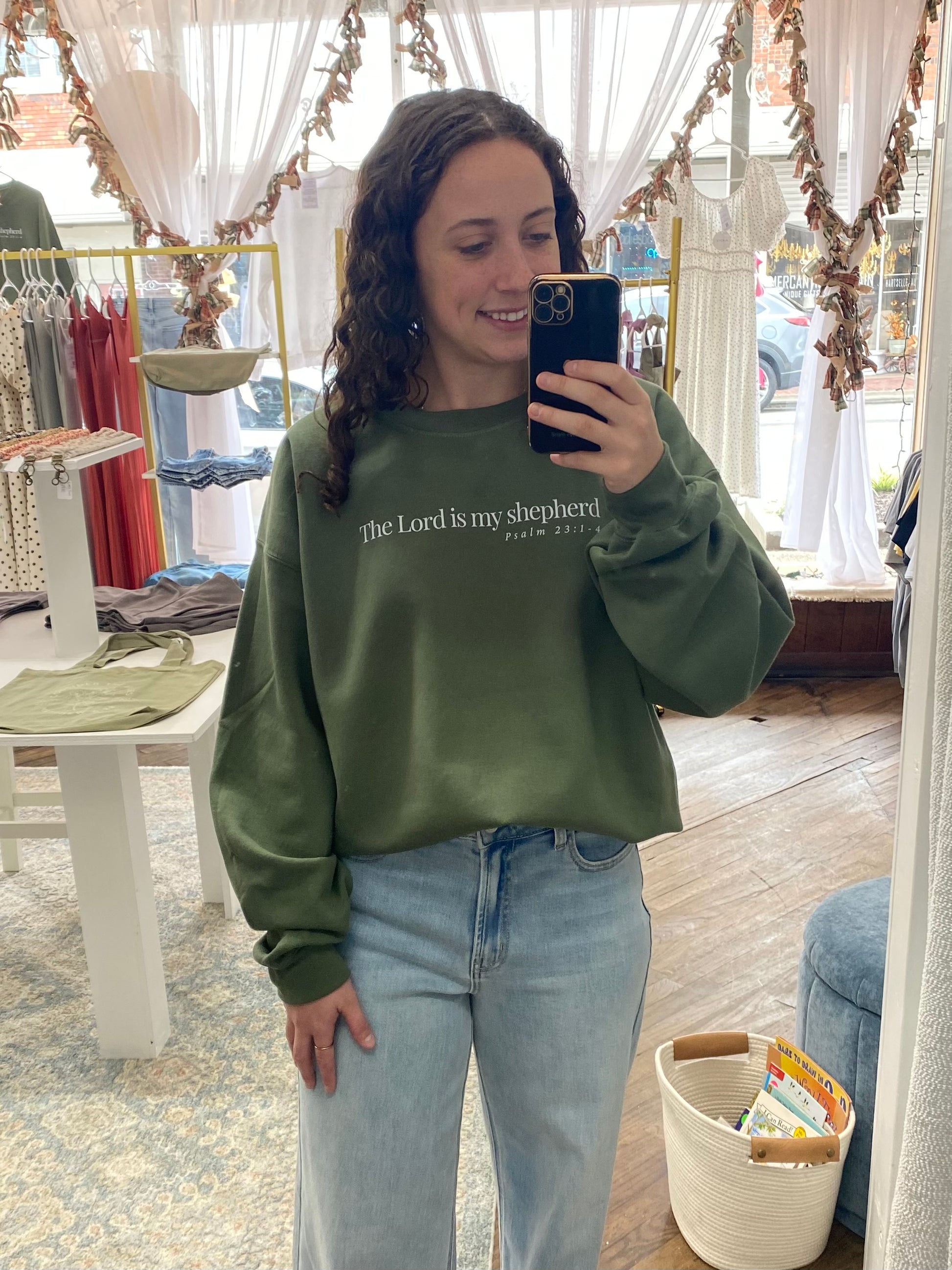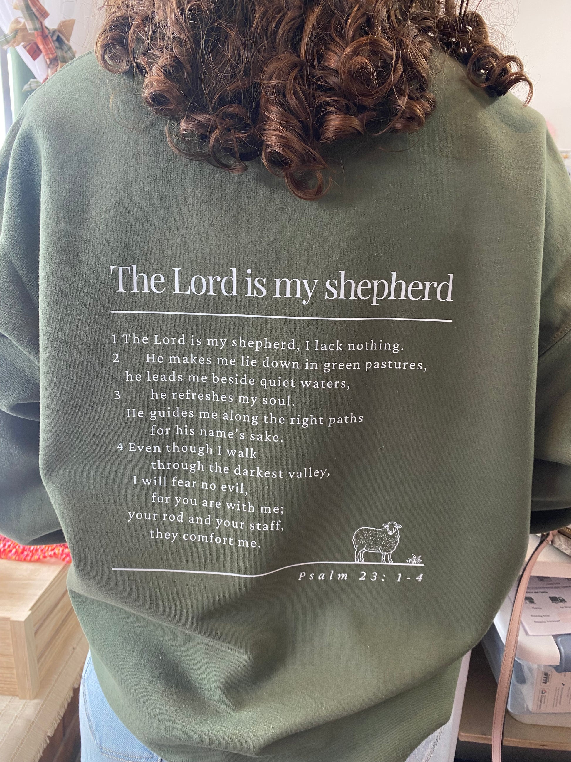 - Front of Sweatshirt: Says "The Lord is my shepherd Psalm 23: 1-4"