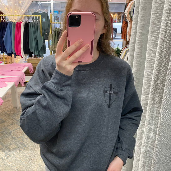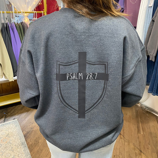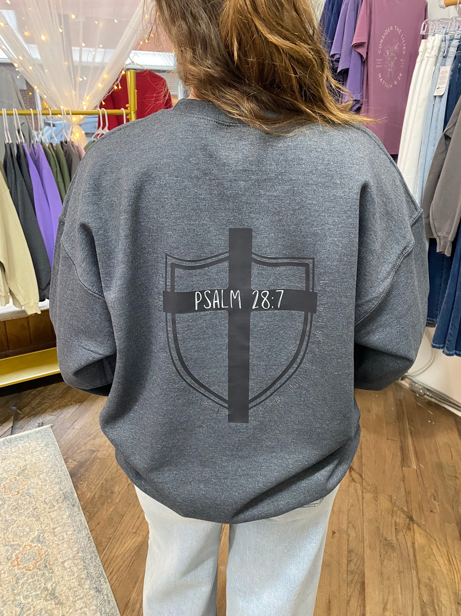 - Front of Sweatshirt: Pocket size design reads Psalm 28:7 with a Shield and Cross Icon