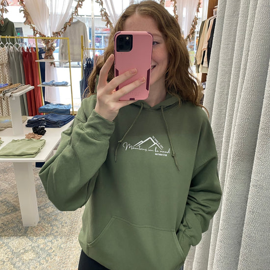 - Front of Sweatshirt: Says "Mountains can be moved" (in cursive writing), "THE POWER OF FAITH", and "MATTHEW 17:20" with an Outline of Mountains