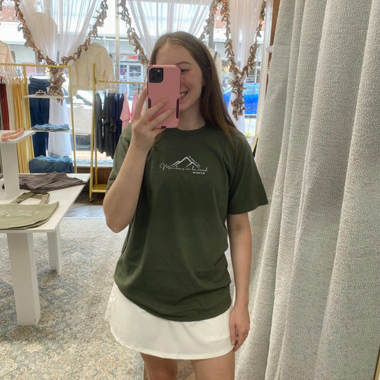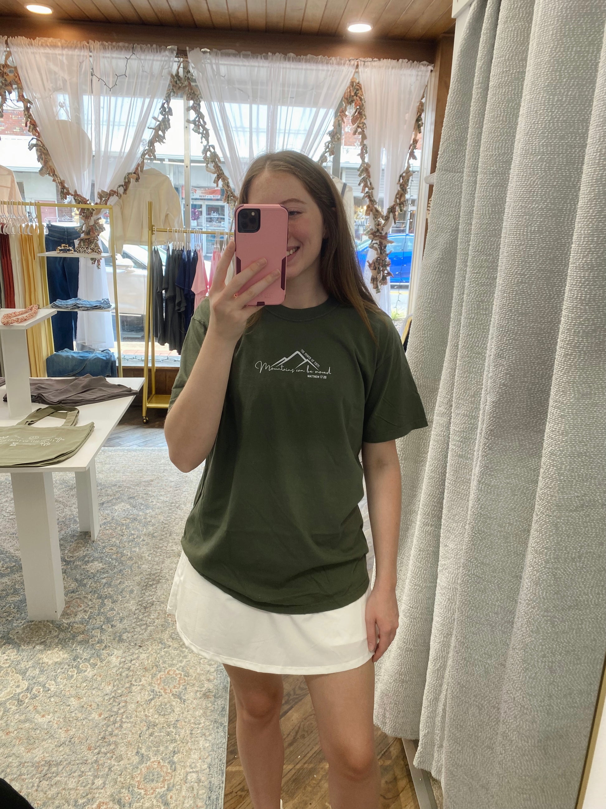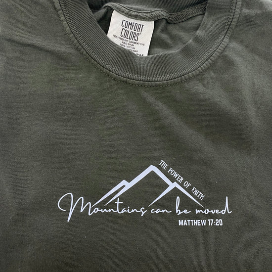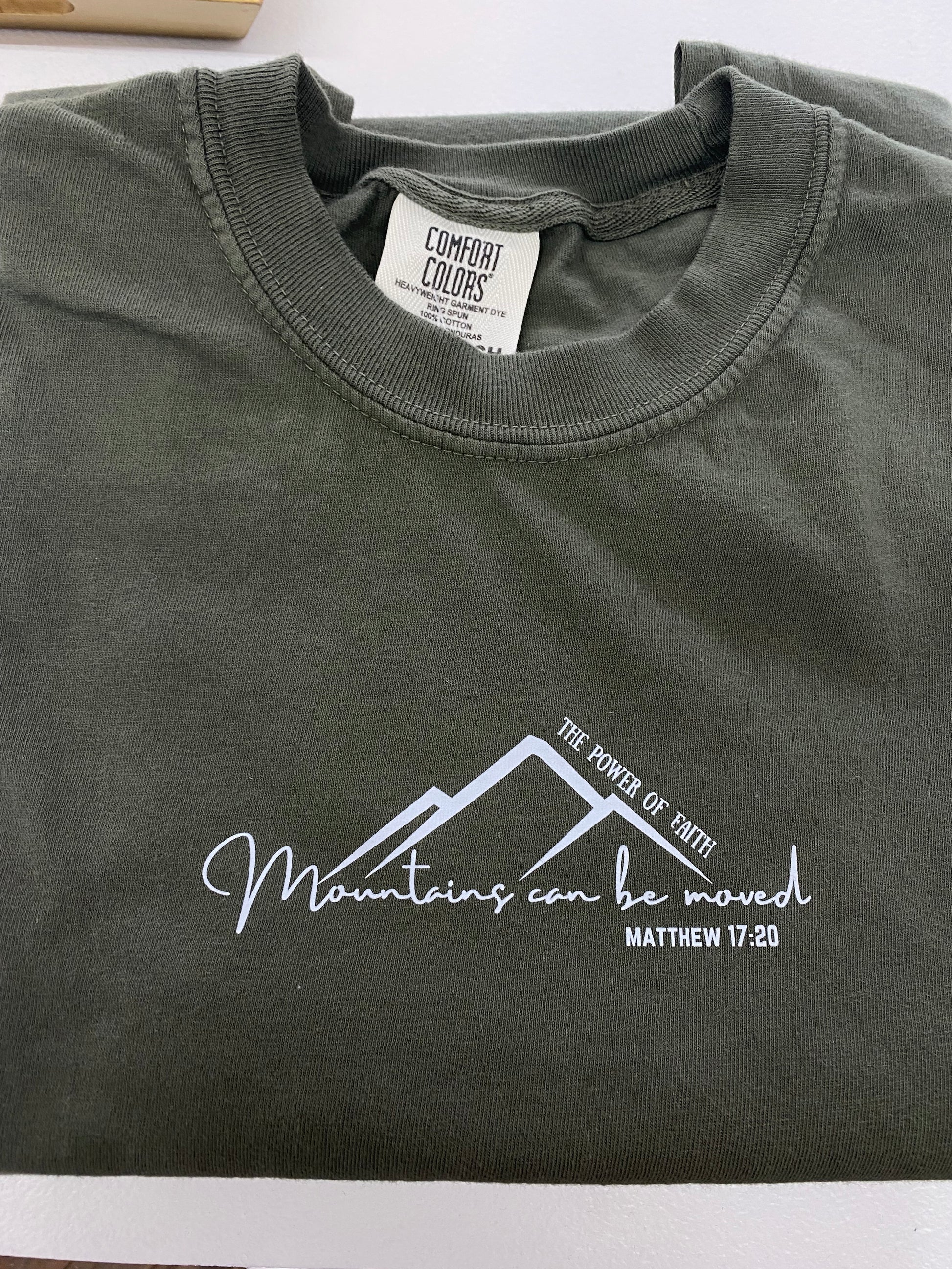 - Front of Tee: Says, "Mountains can be moved" (in cursive writing), "THE POWER OF FAITH", and "MATTHEW 17:20" with an Outline of Mountains