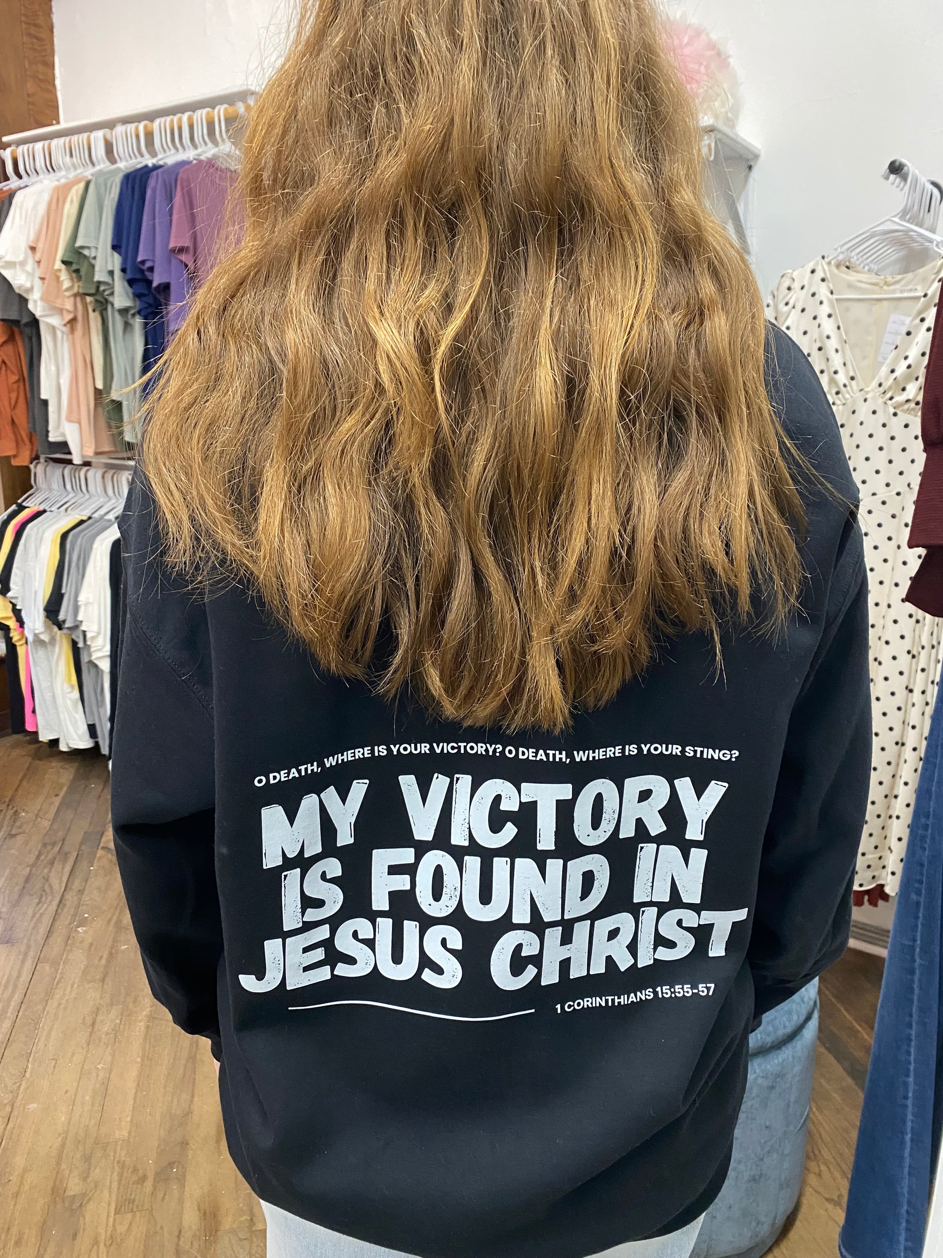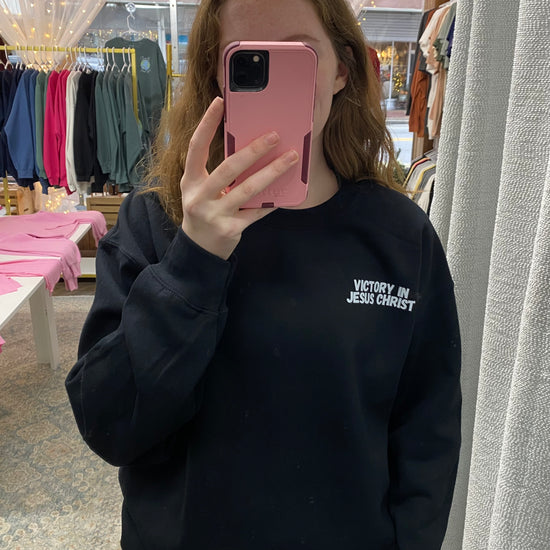 - Front of Sweatshirt: Pocket size design reads "Victory in Jesus Christ"
