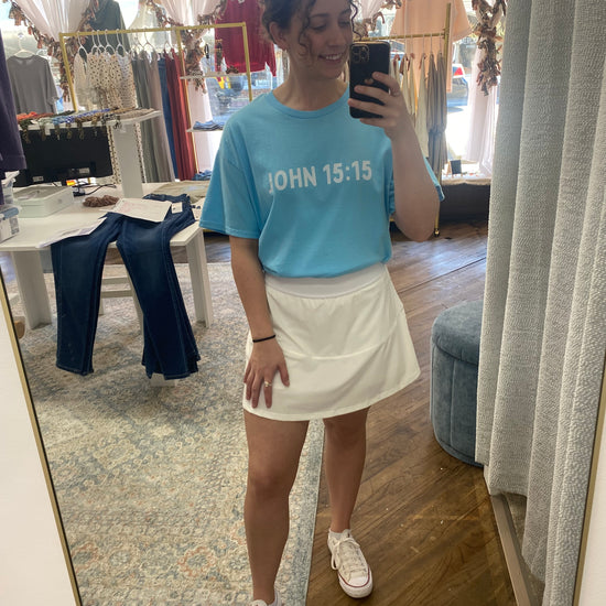 - Color: Sky Blue Tee with White, Peach, and Green Ink