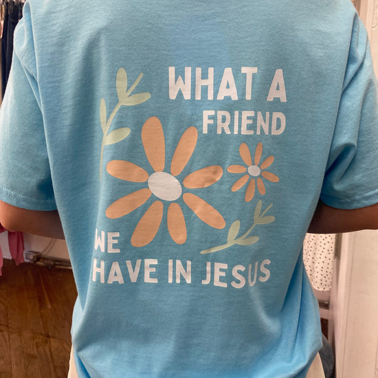- Back of Shirt: Large Design Saying, "WHAT A FRIEND WE HAVE IN JESUS" with Flowers