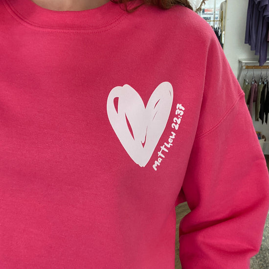 - Front of Sweatshirt: Pocket size design reads Matthew 22:27 with a Heart Icon
